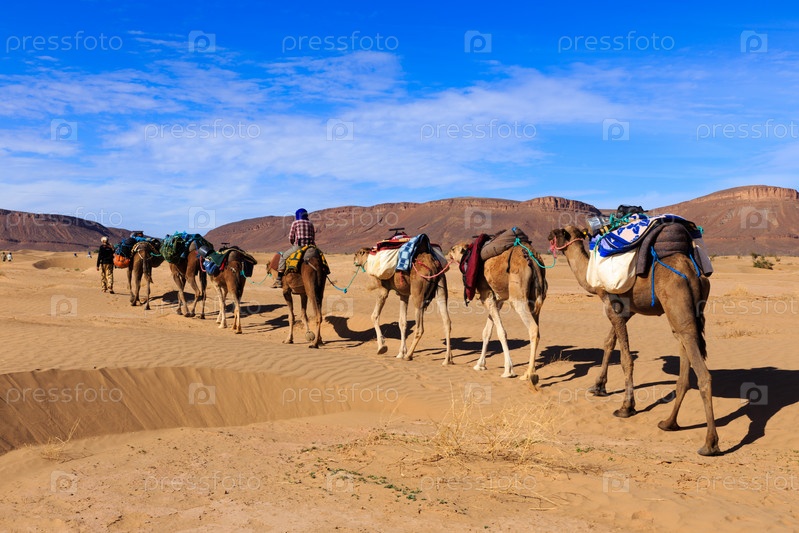 Караван верблюдов в пустыне Сахара в Марокко
