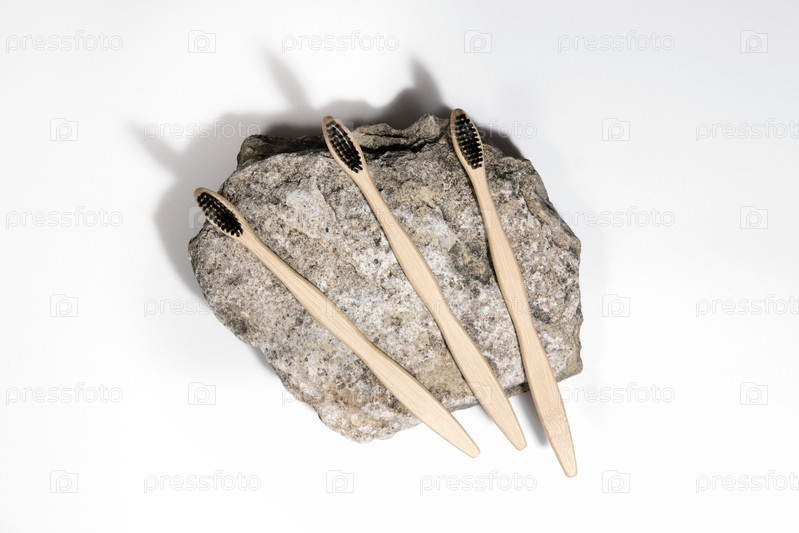 Креативное представление стоматологии и средств по уходу за полостью рта. Бамбуковые зубные щетки на пьедестале подиума, на фоне белого серого стола. Стоматологическая помощь