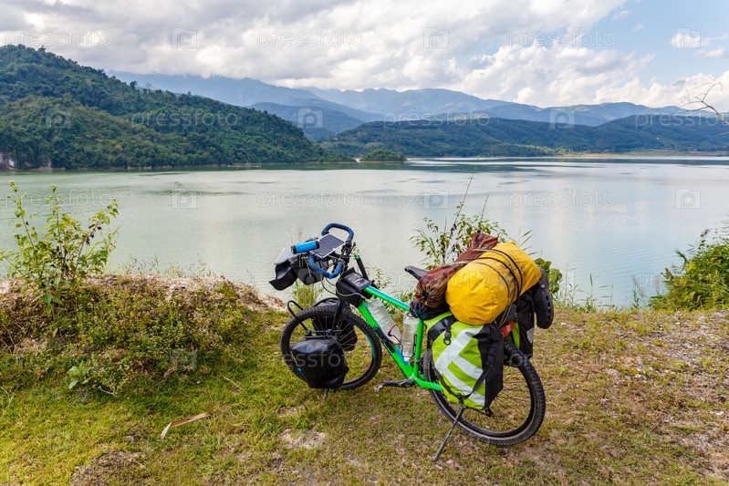 Туристические велосипедные стойки на берегу реки на фоне гор, Вьетнам