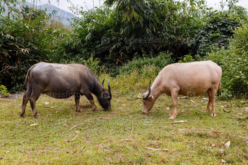 Черно-белый вьетнамский водяной буйвол ест траву