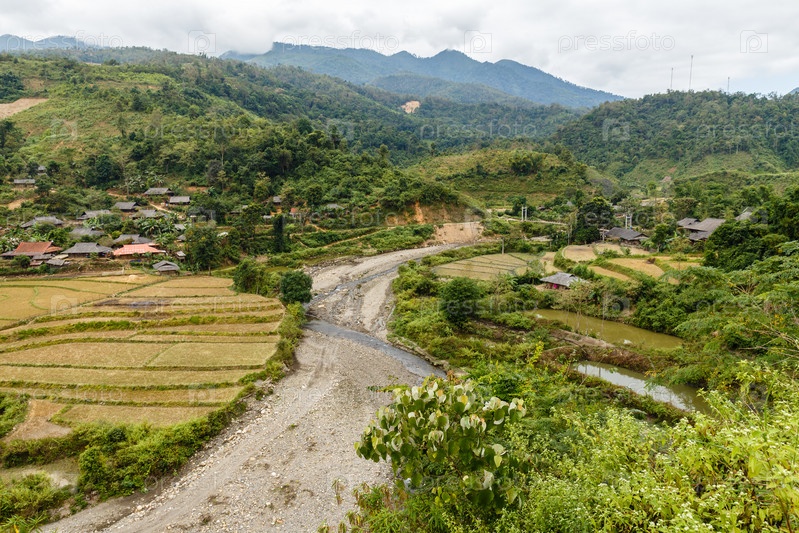 Красивый пейзаж, рисовые поля осенью возле деревни в горах, провинция Дьенбьен, Вьетнам