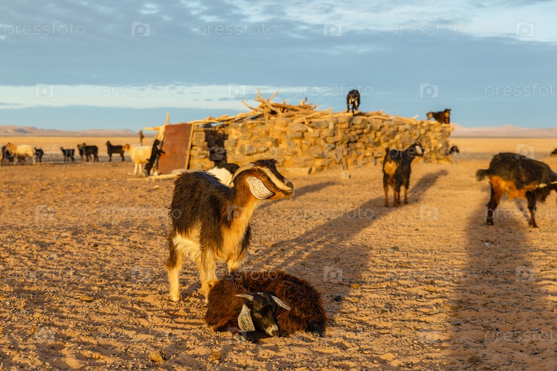 Козы возле берберского дома в пустыне Сахара на рассвете, Марокко