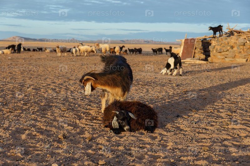 Козы возле берберского дома. Утро в пустыне Сахара в Марокко