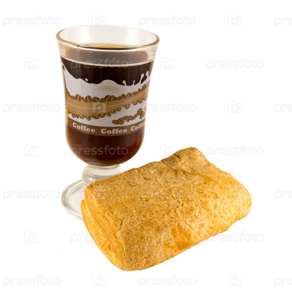 Булочка со сгущенным молоком и чашка кофе на белом фоне