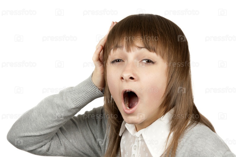 Девушка зевает на белом фоне