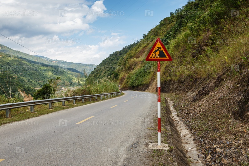 Набережная или берег реки. Дорожный знак на горной дороге во Вьетнаме