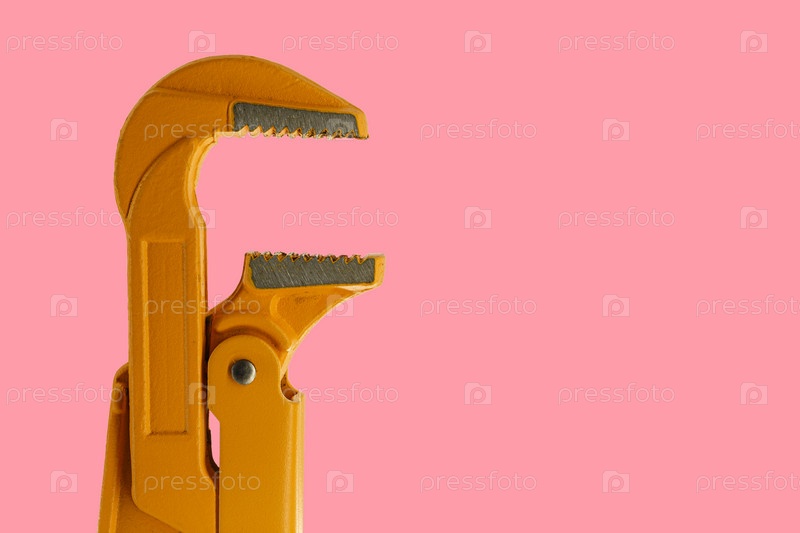 Оранжевый сантехнический ключ на розовом фоне. трубный ключ