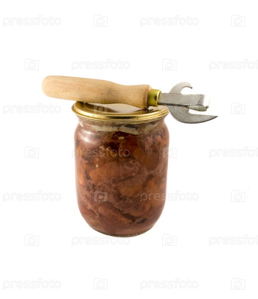 Тушеное мясо и открывалка для бутылок на белом фоне