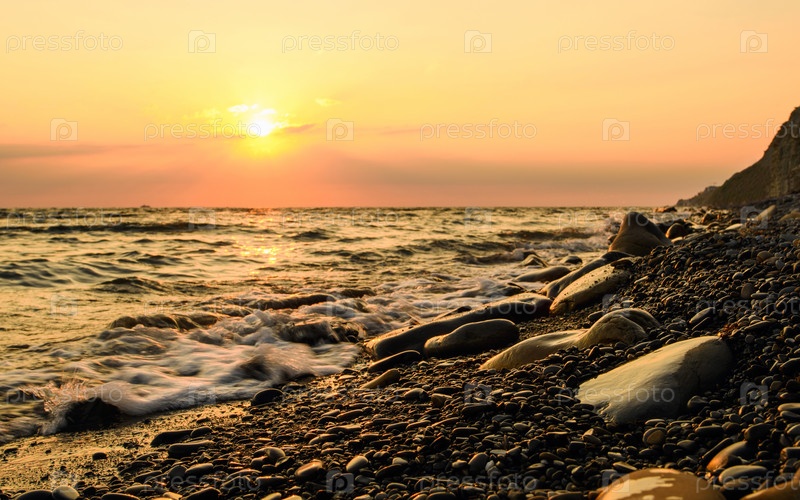 Крупные камни на галечном пляже. Закат у моря. Волны на берегу. Съемка с длинной выдержкой. Сосредоточьтесь на камнях на переднем плане