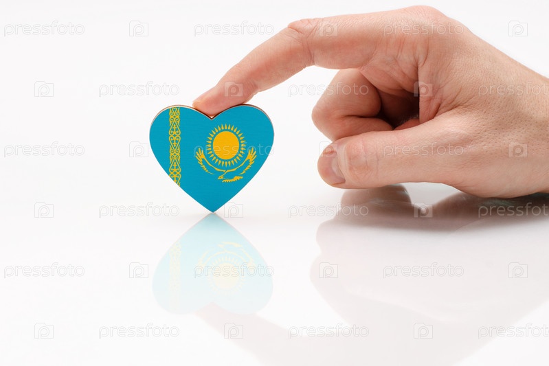 Любите и уважайте Казахстан. Мужская рука держит сердце в форме флага Казахстана на поверхности белого стекла. Концепция казахского патриотизма и гордости