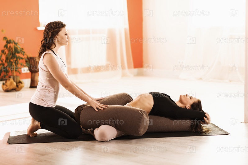 Две женщины в спортивной одежде занимаются йогой, выполняя упражнения Супта баддха конасана с валиками на гимнастическом коврике в студии