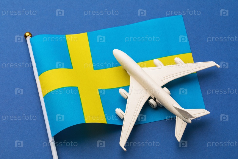 Флаг Швеции и игрушечный самолет на синем фоне, концепция на тему путешествия в Швецию