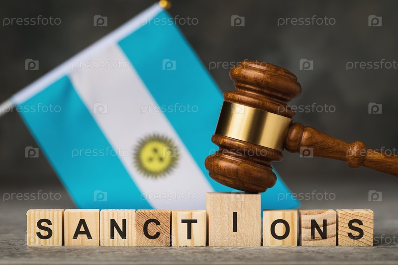 Молоток судьи, деревянные кубики с текстом на фоне аргентинского флага, концепция на тему санкций в Аргентине