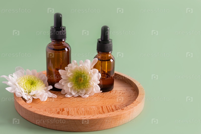 Две косметические бутылки с пипеткой из темного стекла с натуральным средством, маслом, сывороткой для личной гигиены на деревянном подносе с цветами. зеленый фон