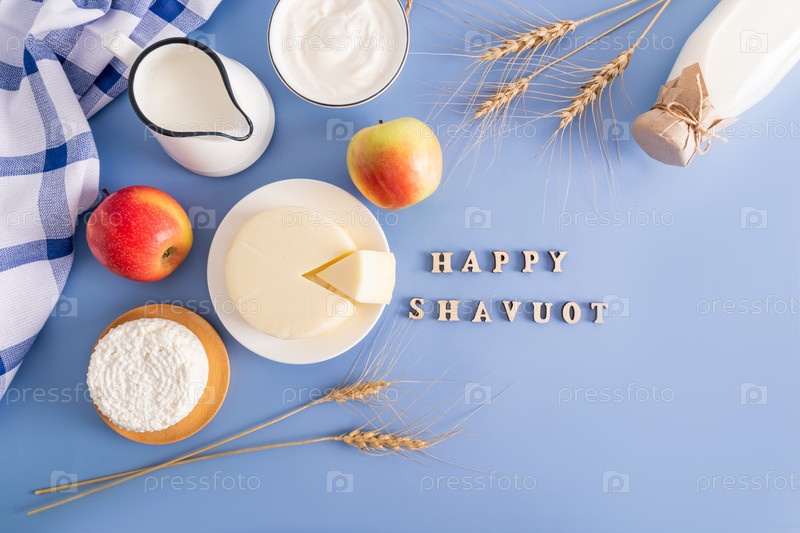 Плоская планировка молочных продуктов, ушей, яблок на синем фоне с деревянными буквами счастливого шавуота. концепция еврейского весеннего праздника