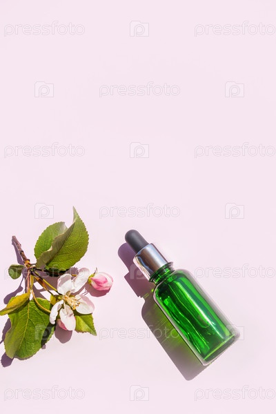 Прозрачная зеленая бутылка с сывороткой для ухода за кожей лица и тела. омолаживающая натуральная косметика. вид сверху. розовый фон. розовые цветы яблони