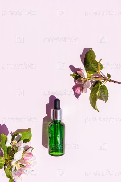 Вертикальный вид сверху флакона с пипеткой с увлажняющей сывороткой для омоложения кожи лица. натуральная косметика. розовые цветы яблони