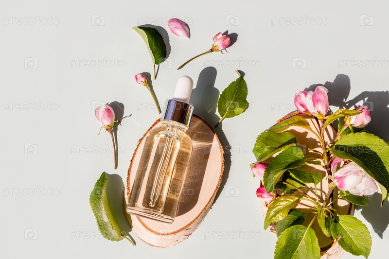 Прозрачная косметическая бутылка с натуральным средством по уходу за лицом и телом лежит на срезе дерева среди весенних цветов яблони