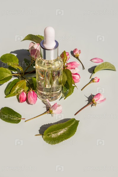Вертикальный вид сверху флакона с пипеткой с увлажняющей сывороткой для омоложения кожи лица. натуральная косметика. розовые цветы яблони