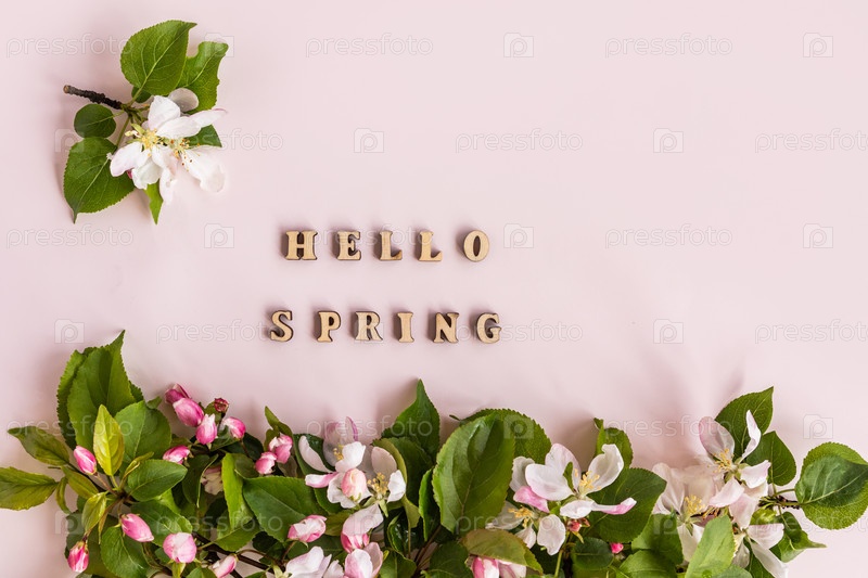 Вид сверху на цветущие ветки яблони и деревянные буквы с текстом привет весна на розовом фоне. плоская кладка. рамка, открытка