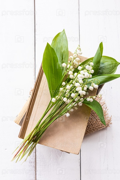 Красивый букет весенних ландышей лежит на стопке старых книг. вид сверху. белый деревянный стол. концепция весеннего настроения