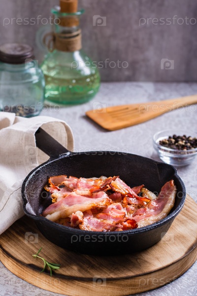 Жареный бекон на сковороде готов к ужину на столе. Вертикальный вид