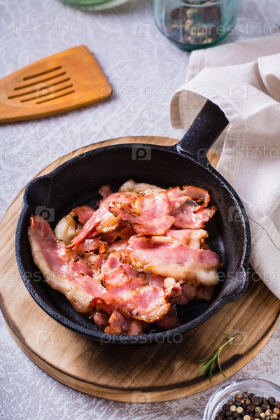 Хрустящие полоски бекона, обжаренные на сковороде на столе. Вертикальный вид