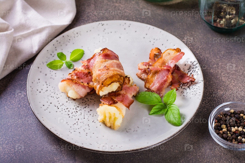 Рулетики из жареного бекона с картофельным пюре и базиликом на тарелке на столе