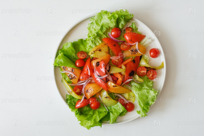 Запеченные овощи на гриле. Кусочки сладкого перца, красный лук, помидоры черри со специями на листьях салата. Вид сверху. Копировать пространство