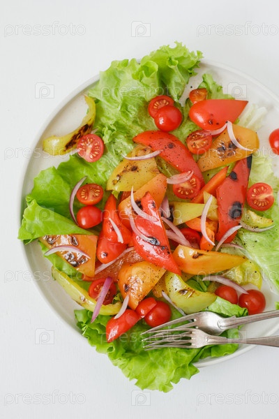 Запеченные овощи на гриле. Кусочки сладкого перца, красный лук, помидоры черри со специями на листьях салата. Вид сверху. Копировать пространство