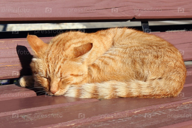 Рыжий кот спит на деревянной скамейке в летний день