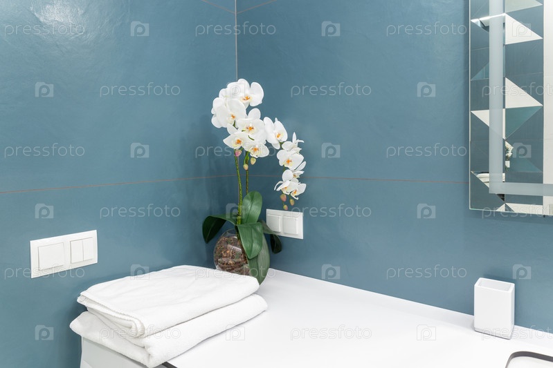 Сине-белая ванная комната с большим зеркалом, полотенцами, освещением и столешницей. Чистая и свежая ванная комната с современным освещением. Просторная ванная комната, чистая, красивая, роскошная, светлая комната
