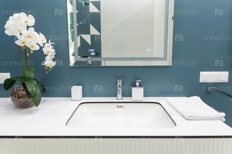 Сине-белая ванная комната с большим зеркалом, полотенцами, освещением и столешницей. Чистая и свежая ванная комната с современным освещением. Просторная ванная комната, чистая, красивая, роскошная, светлая комната