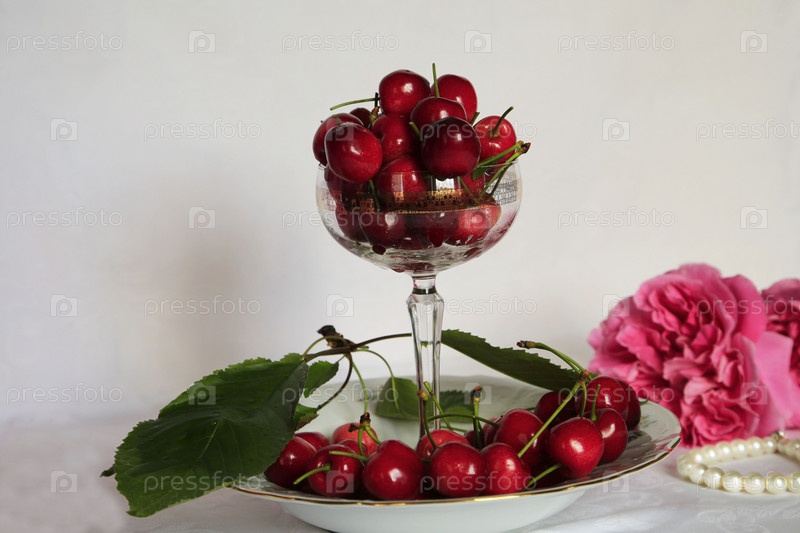 Черешня, вишня, натюрморт с фруктами и цветами