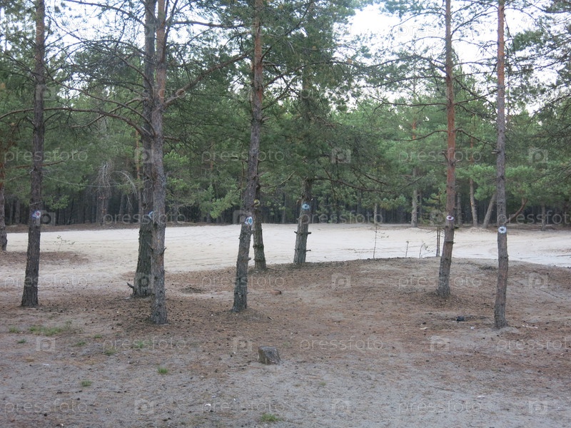 Сосны на песчаном берегу с нарисованными глазами в Лопатинских карьерах