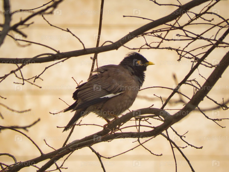 Обыкновенная майна на ветке во дворе в Бишкеке