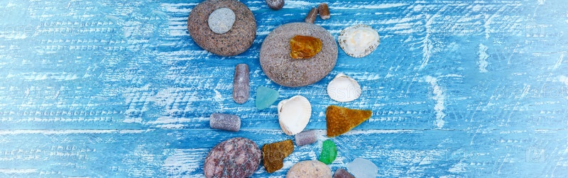 Пирамида из морских камней на синем фоне. Морская галька и ракушки на столе