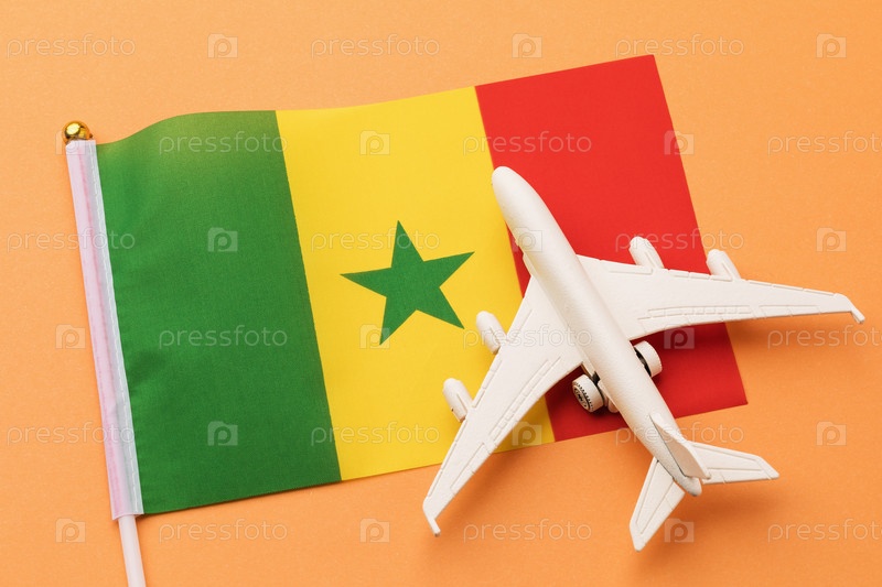 Флаг Сенегала и игрушечный самолет на оранжевом фоне
