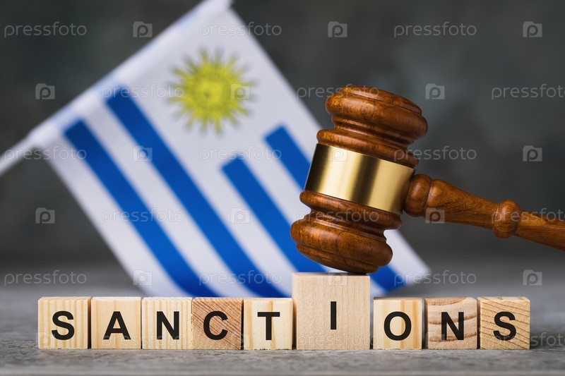 Молоток судьи, деревянные кубики с текстом на фоне флага Уругвая, концепция на тему санкций в Уругвае