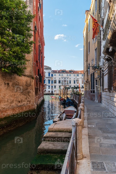 Узкая улица с пришвартованными гондолами в исторической части Венеции, Италия