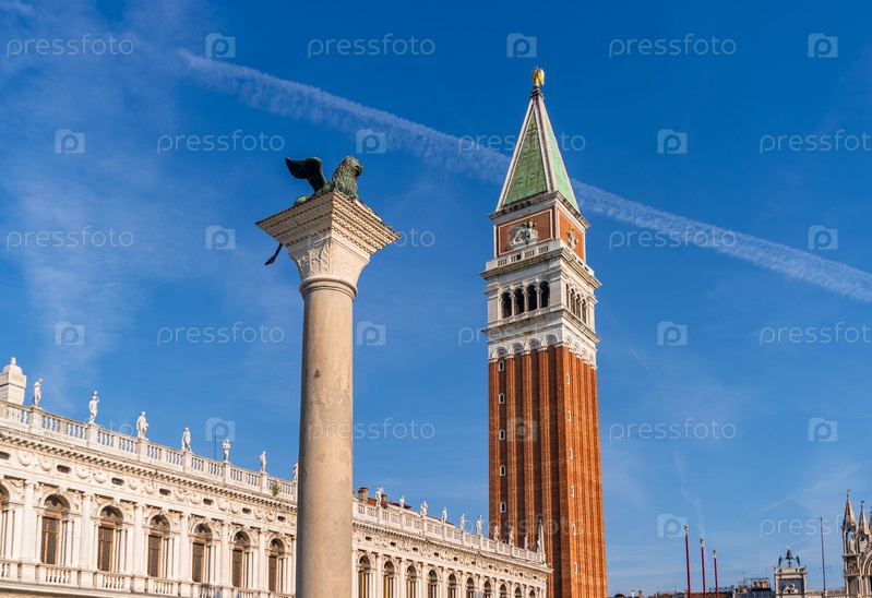 Венеция, Италия. Вид на Колонну Сан-Марко со львом и колокольню Святого Марка на фоне голубого неба