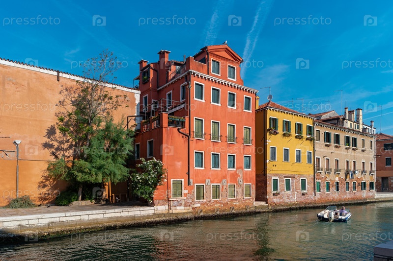 Венецианская улица с яркими домами и морским каналом. Жилой район Венеции, Италия