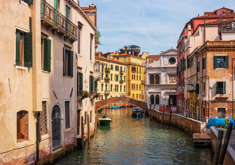 Венеция, Италия. Живописный виниканский пейзаж с традиционными итальянскими домами и мостом через канал