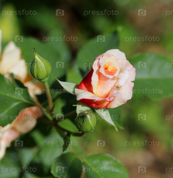Роза с бутонами на зеленом фоне с зеленым насекомым на лепестке
