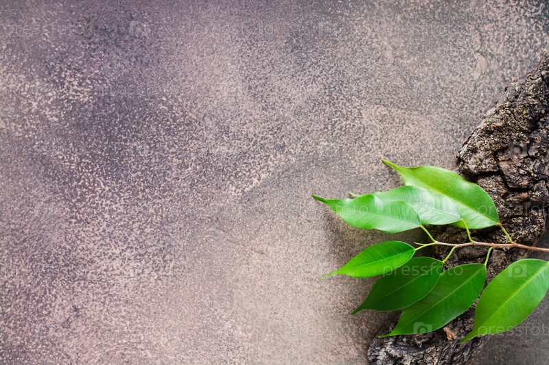 Ветка с листьями на коре дерева на коричневом фоне. Естественная плоская кладка