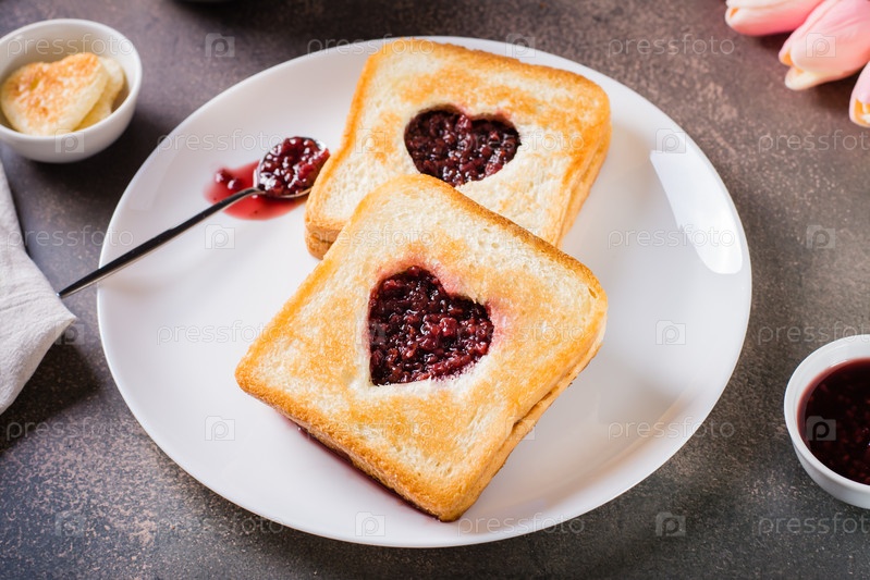 Тост с сердцем, наполненным малиновым джемом на тарелке. Завтрак на пару