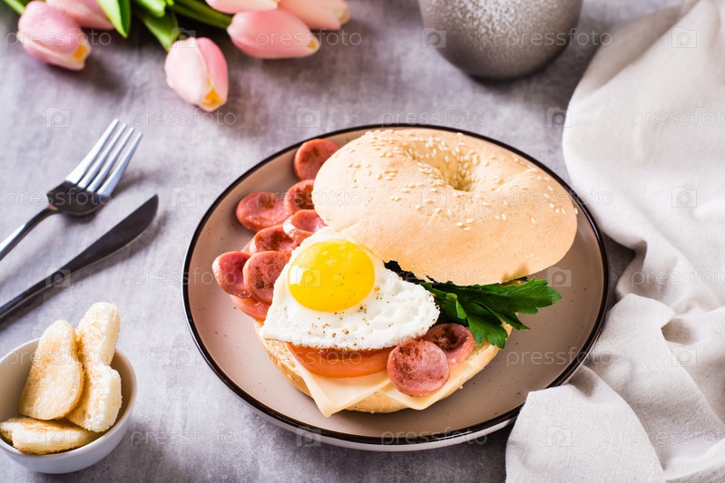Сердце жареного яйца, помидоры, сыр и петрушка в рогалике на тарелке. Романтический завтрак