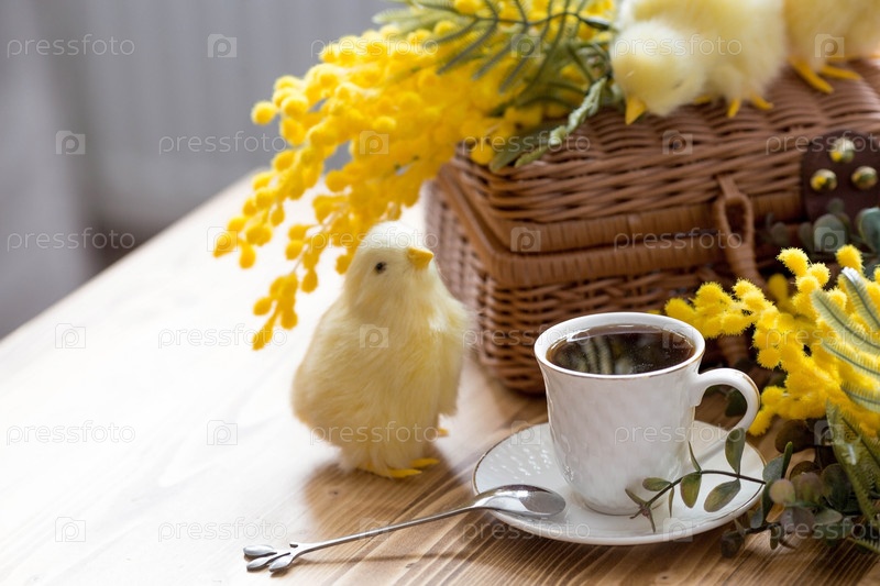 Мимоза, плетеный чемодан, цыплята и чашка кофе. Понятие домашнего уюта. Концепция весны в доме и Международного женского дня 8 марта
