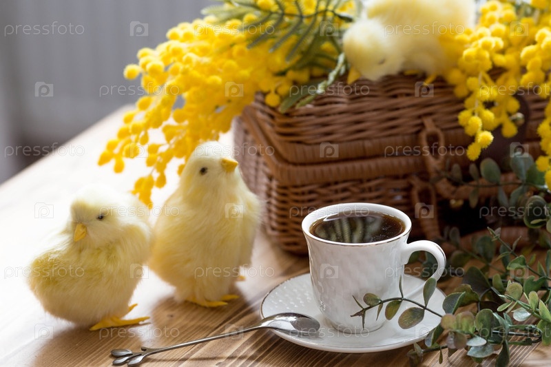 Мимоза, плетеный чемодан, цыплята и чашка кофе. Понятие домашнего уюта. Концепция весны в доме и Международного женского дня 8 марта