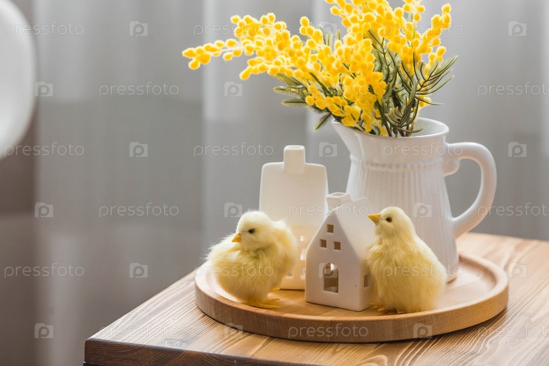 Букет мимозы на деревянном столе, цыплята и белые домики. Интерьер гостиной на заднем плане. Понятие домашнего уюта. Концепция весны в доме и Международного женского дня 8 марта